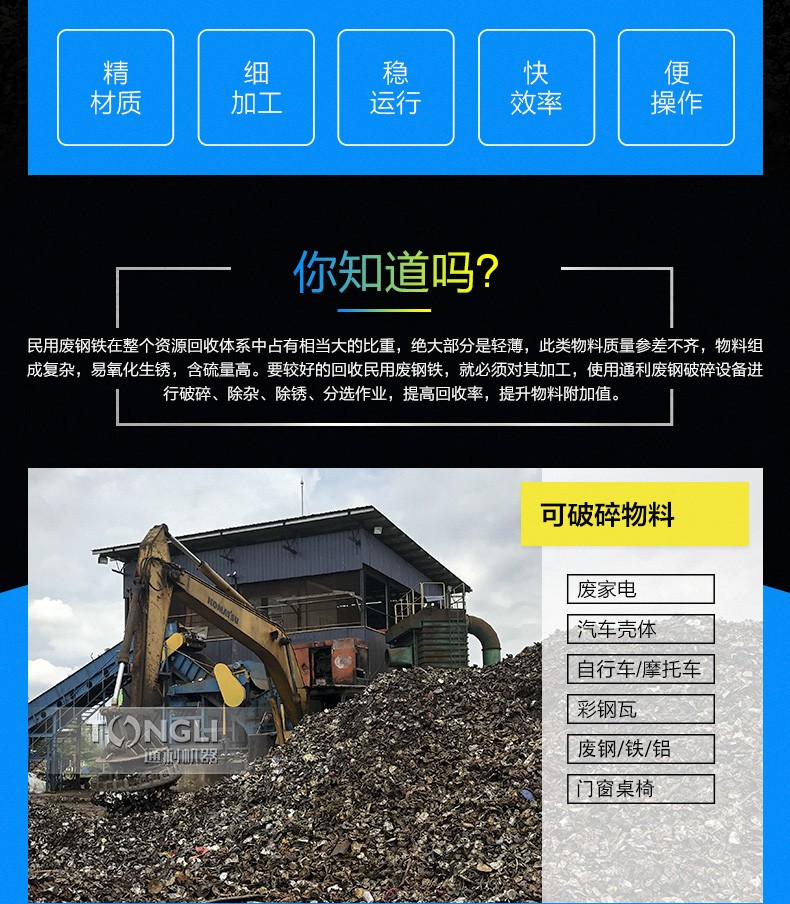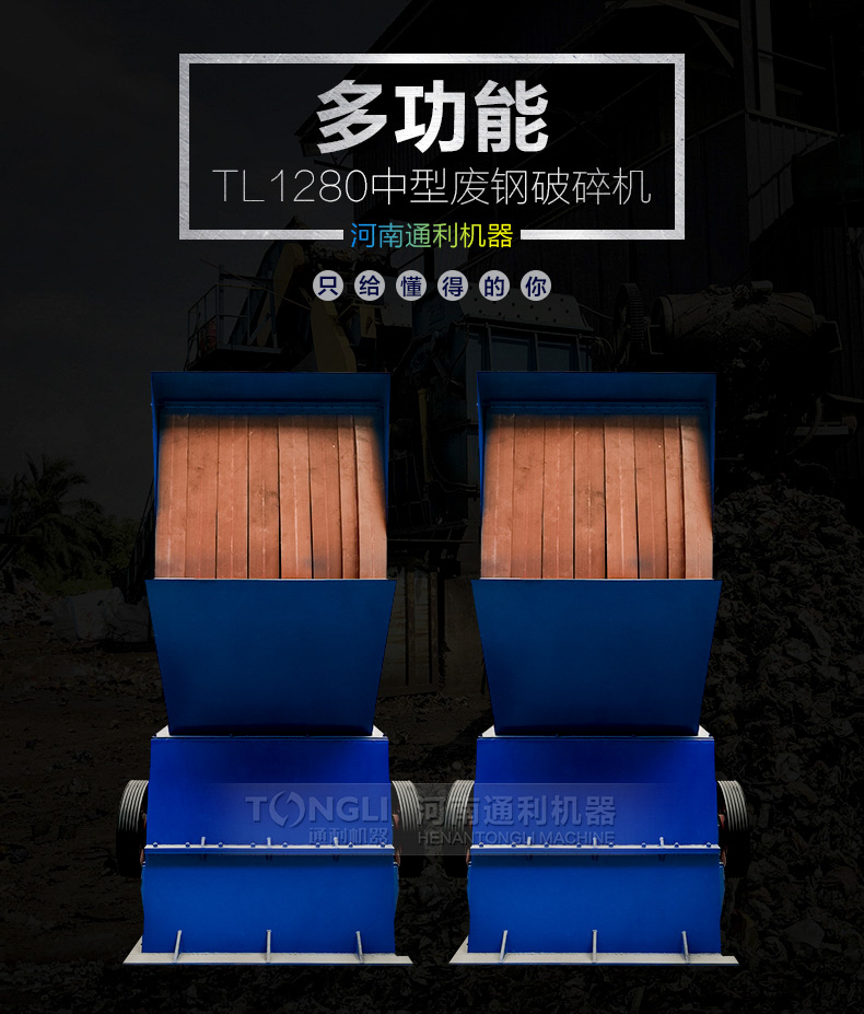 废钢破碎机是结合市场需求而成的产品。主要针对量废弃金属的再生利用,进行预破碎处理,并清理表面的油漆和污垢。该机产能每小时3T左右。