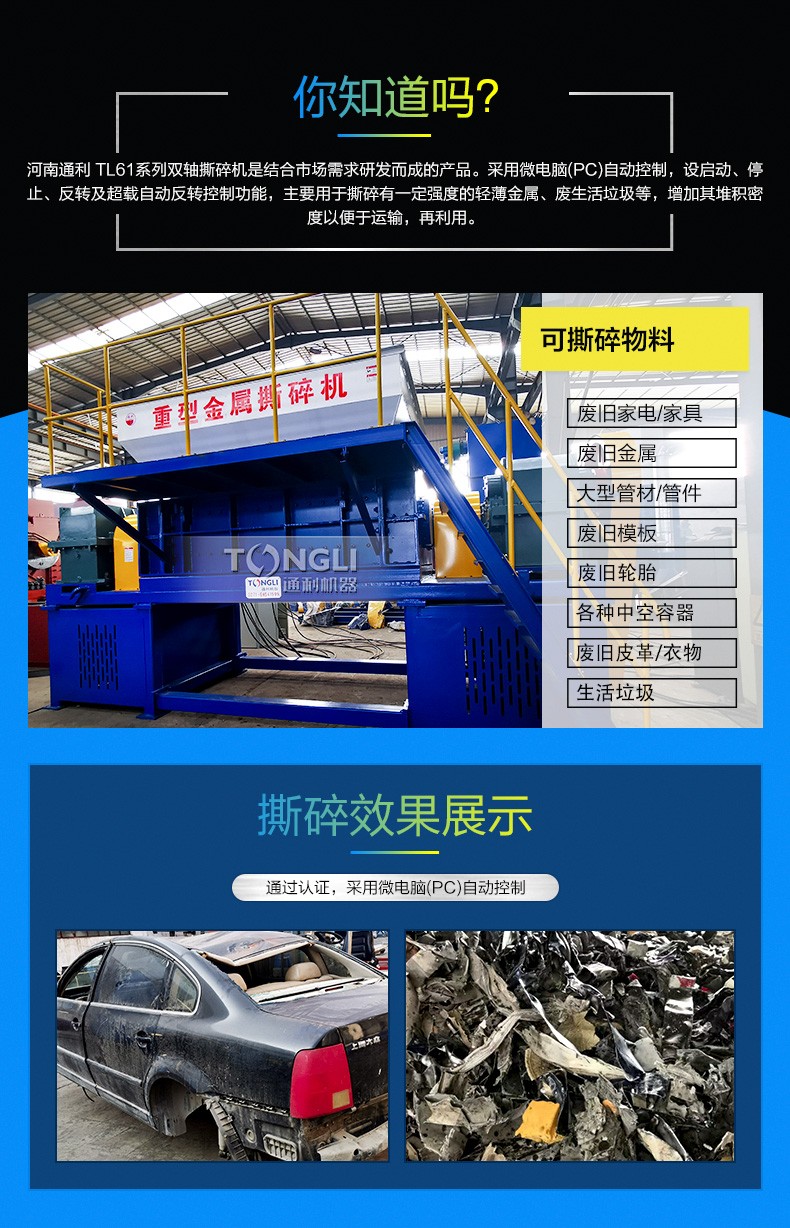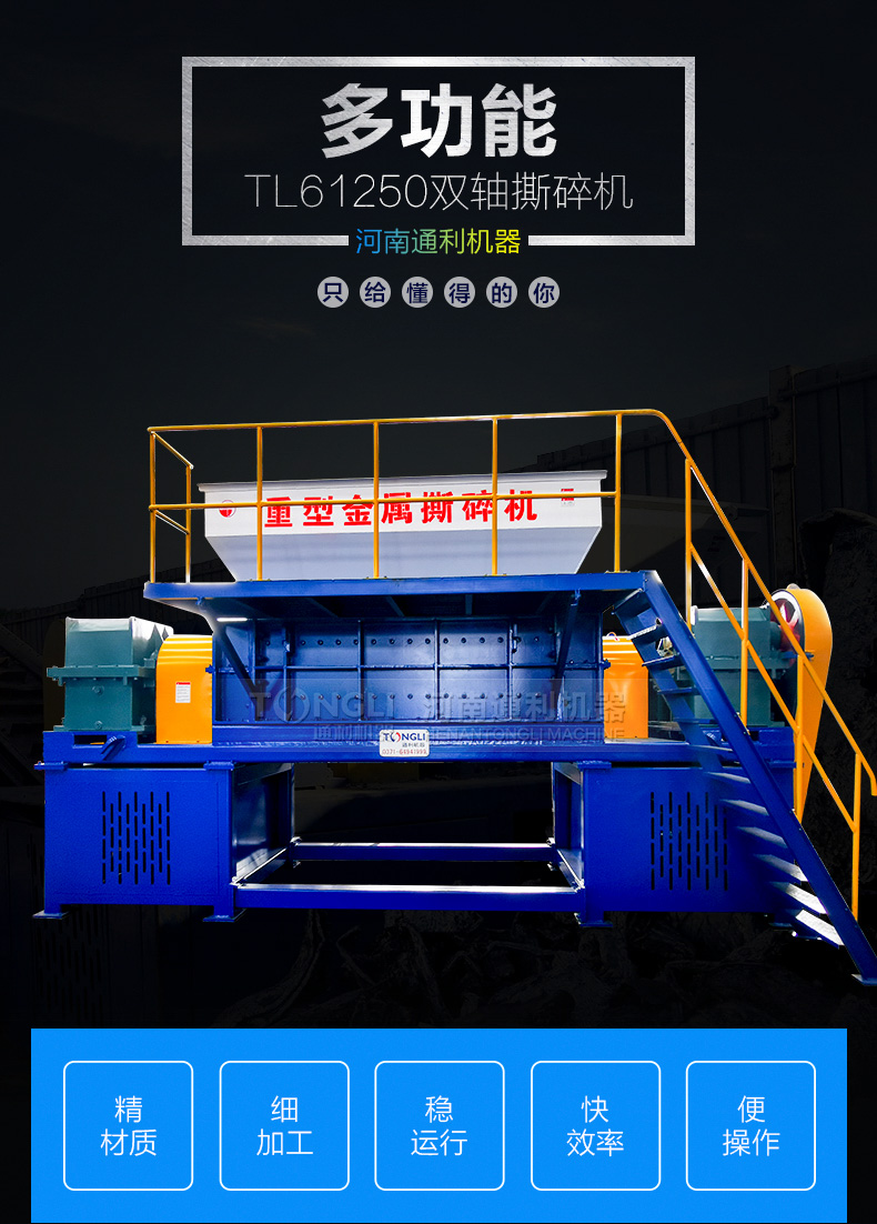 双轴撕碎机是结合市场需求而成的产品。采用微电脑(PC)自动控制,设启动、停止、反转及载自动反转控制功能,主要用于撕碎有一定强度的轻薄金属、废生活垃圾等,增加其堆积密度以便于运输,再利用。