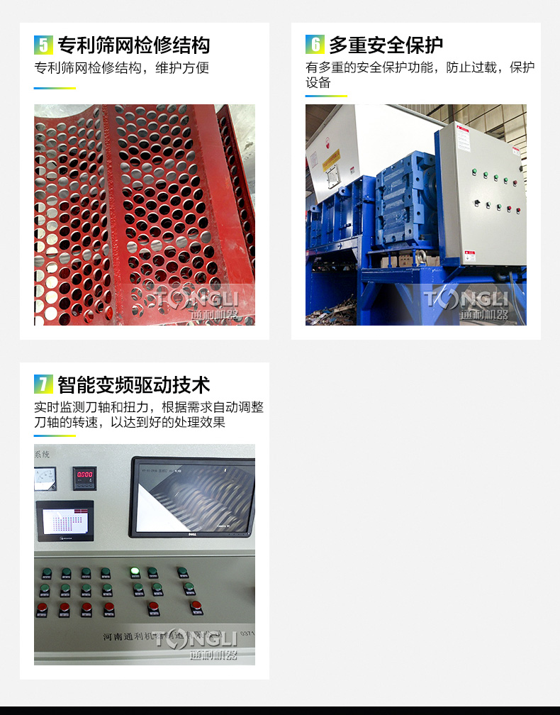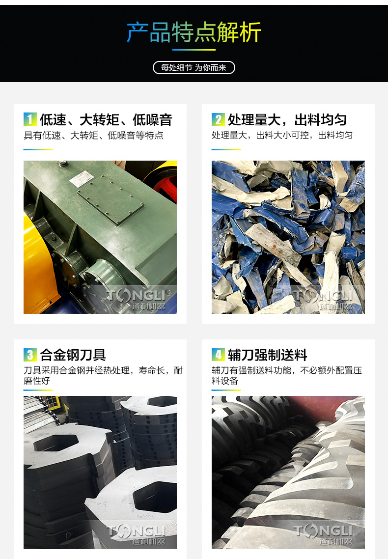 通利四轴剪切式撕碎机,破碎腔由上层双辅刀轴和下层的双主力刀轴构成。上层辅刀具有强制给料功能,可增加主刀的有效破碎产量,同时尺寸物料被带回破碎腔重复破碎,达到控制出料尺寸的目的。下层主刀特有切刀外形,结合了砍劈与剪切的技术,达到剪断、破碎、撕裂、穿刺、劈砍等破裂减容功能。四轴破碎机是有效达到各种固废和均匀破碎的关键设备。