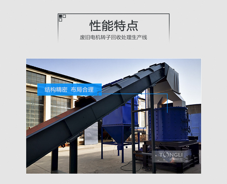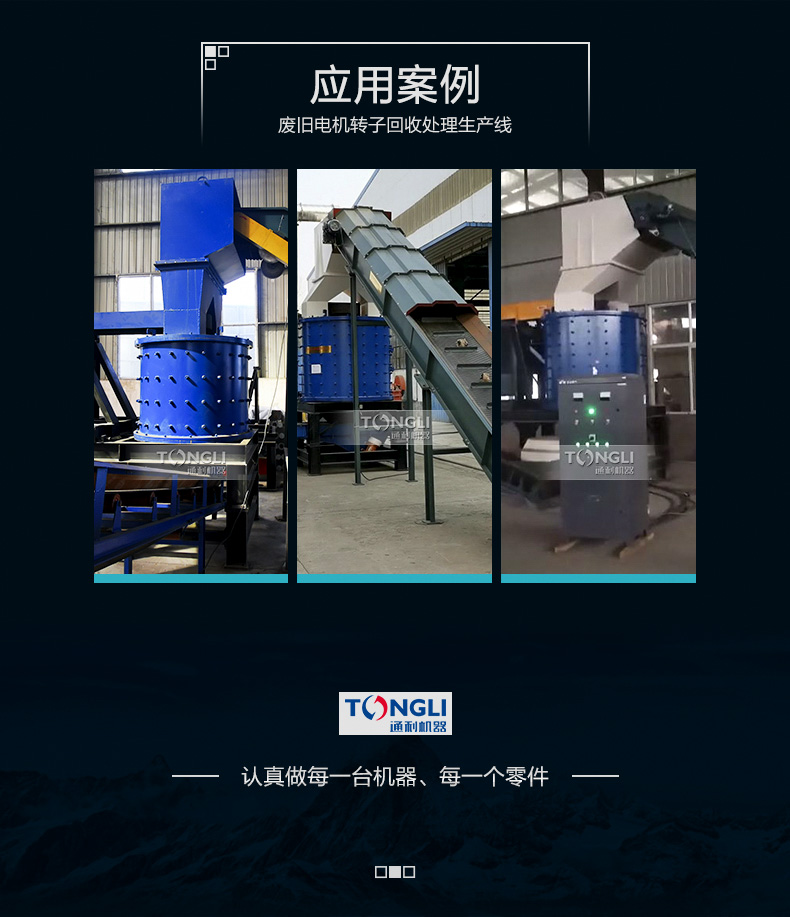 废旧电机(马达)中很有较多的铜和铝等材料,回收利用价值较,通利机器转子破碎机设备破碎比,前期对废旧电机转子进行破碎,后半程将破碎料里面的各类金属分类回收,然后产品附加值,利润可观。